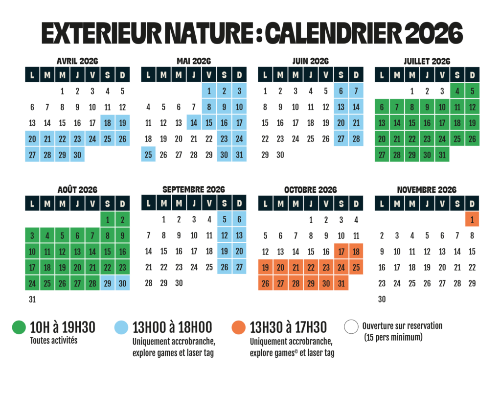 Extérieur Nature est ouvert toute l’année pour les sorties canyoning en eau chaude, via ferrata et escalade. Les autres activités sont proposées d’avril à novembre ou en été. Les jours et horaires d’ouverture varient en fonction des activités et des périodes de l’année :